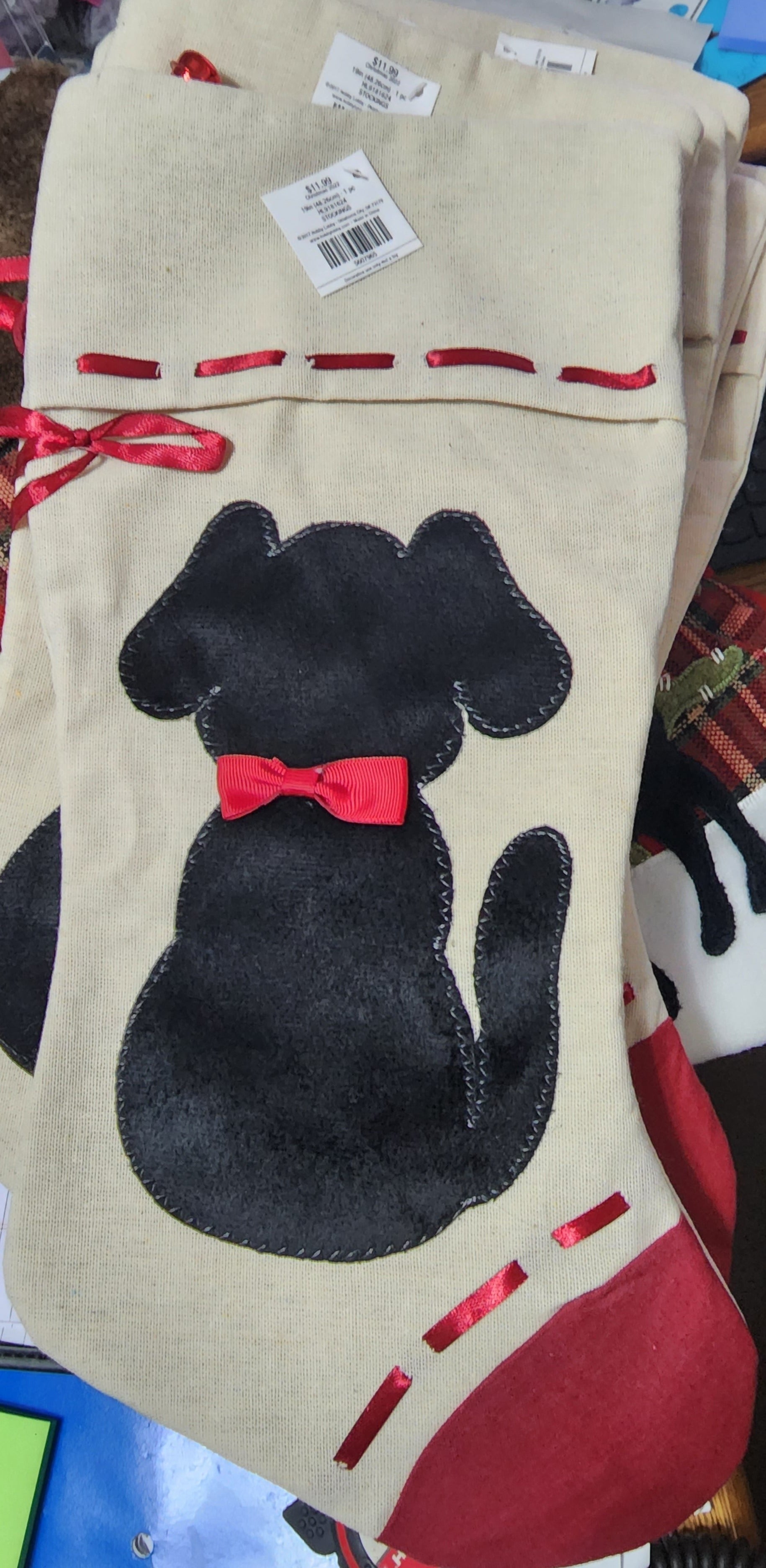 This is a Cream - Beige colored DOG Stocking that is decorated with a Fine Soft Velvety Black Shape of a DOG with a Red Bow around their collar and 2 Small Jingle Bells with Stitched Red Ribbon throughout, that any FUR Baby would love to have at Christmas!