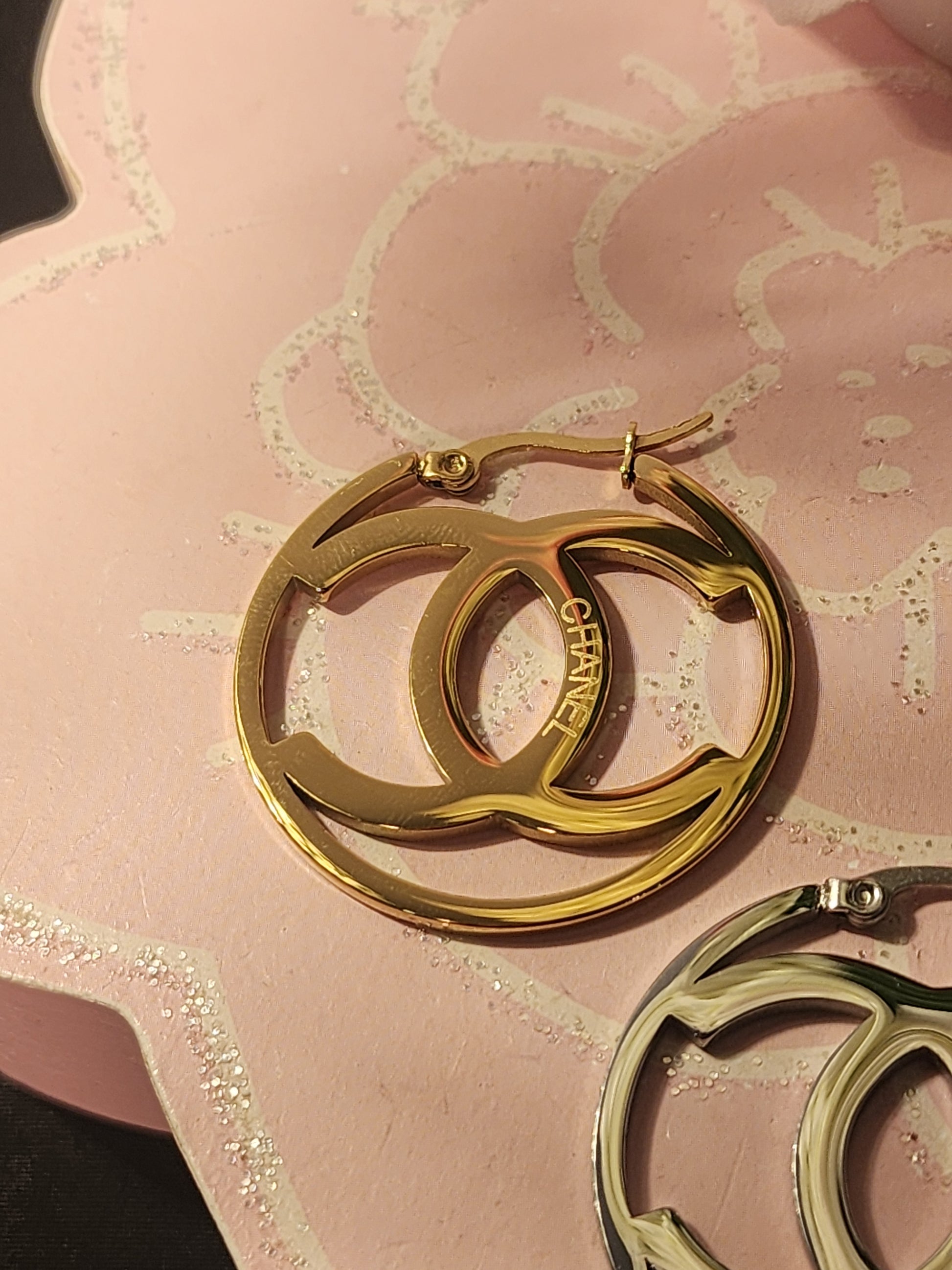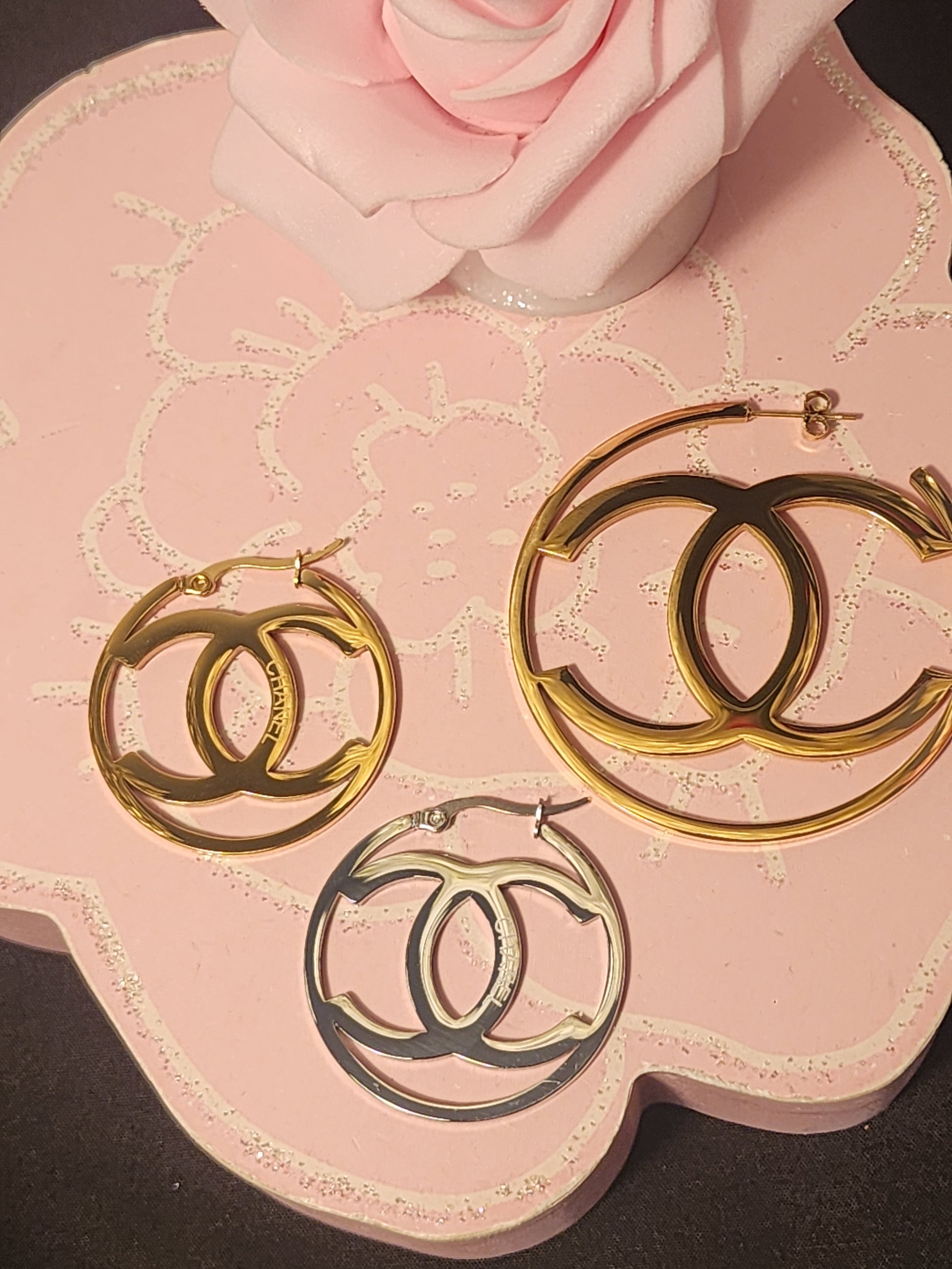Choose from Gold or Silver Stamped Fashion Stainless Steel 1.5inch, Hoop Earrings or Gold 2inch Stainless Steel Fashion Hoop Earrings!