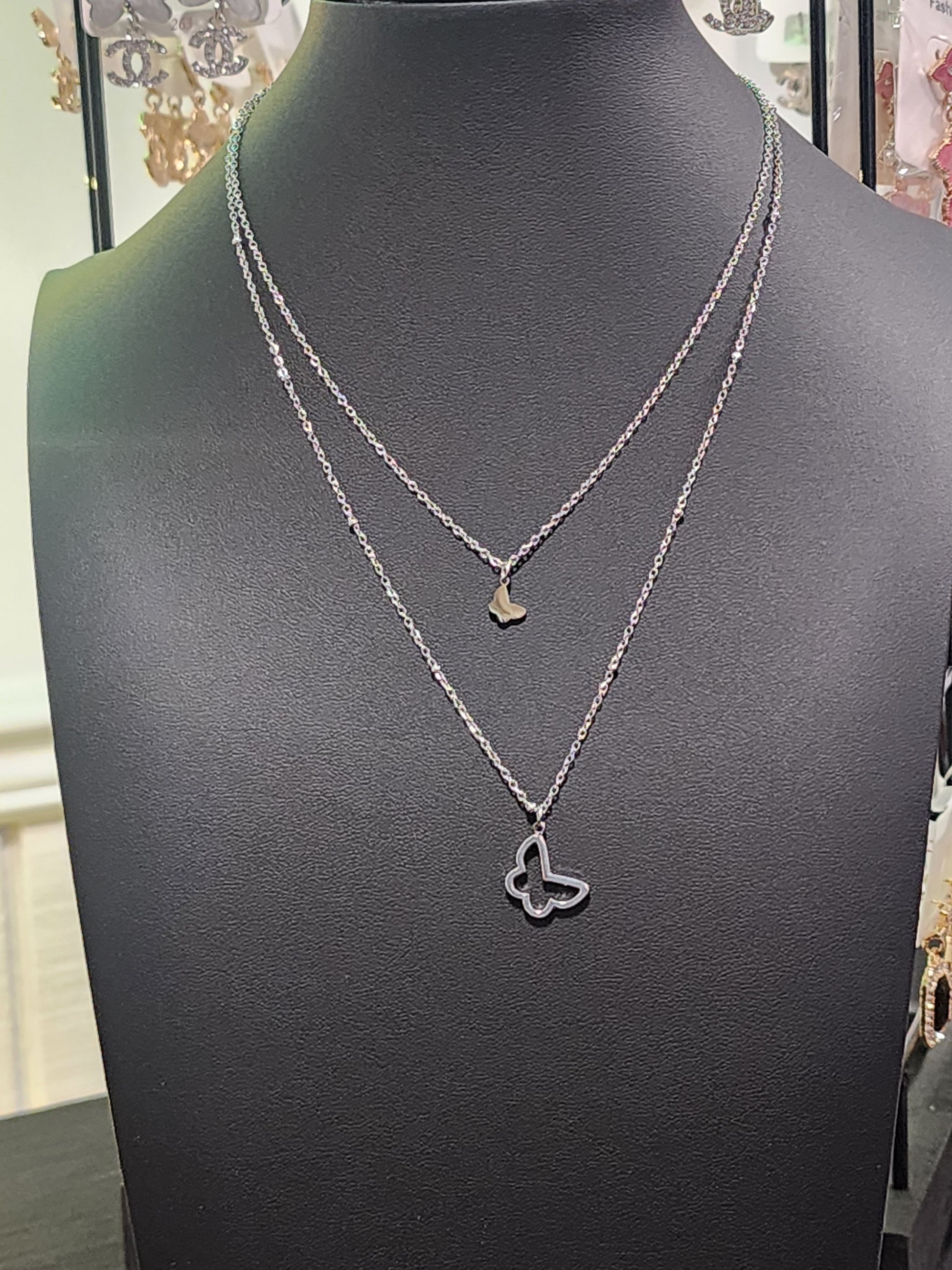 Style 1 is a 18inch Multi-Layered Silver Stainless Steel Necklace with 2 Dainty Butterfly Pendants.