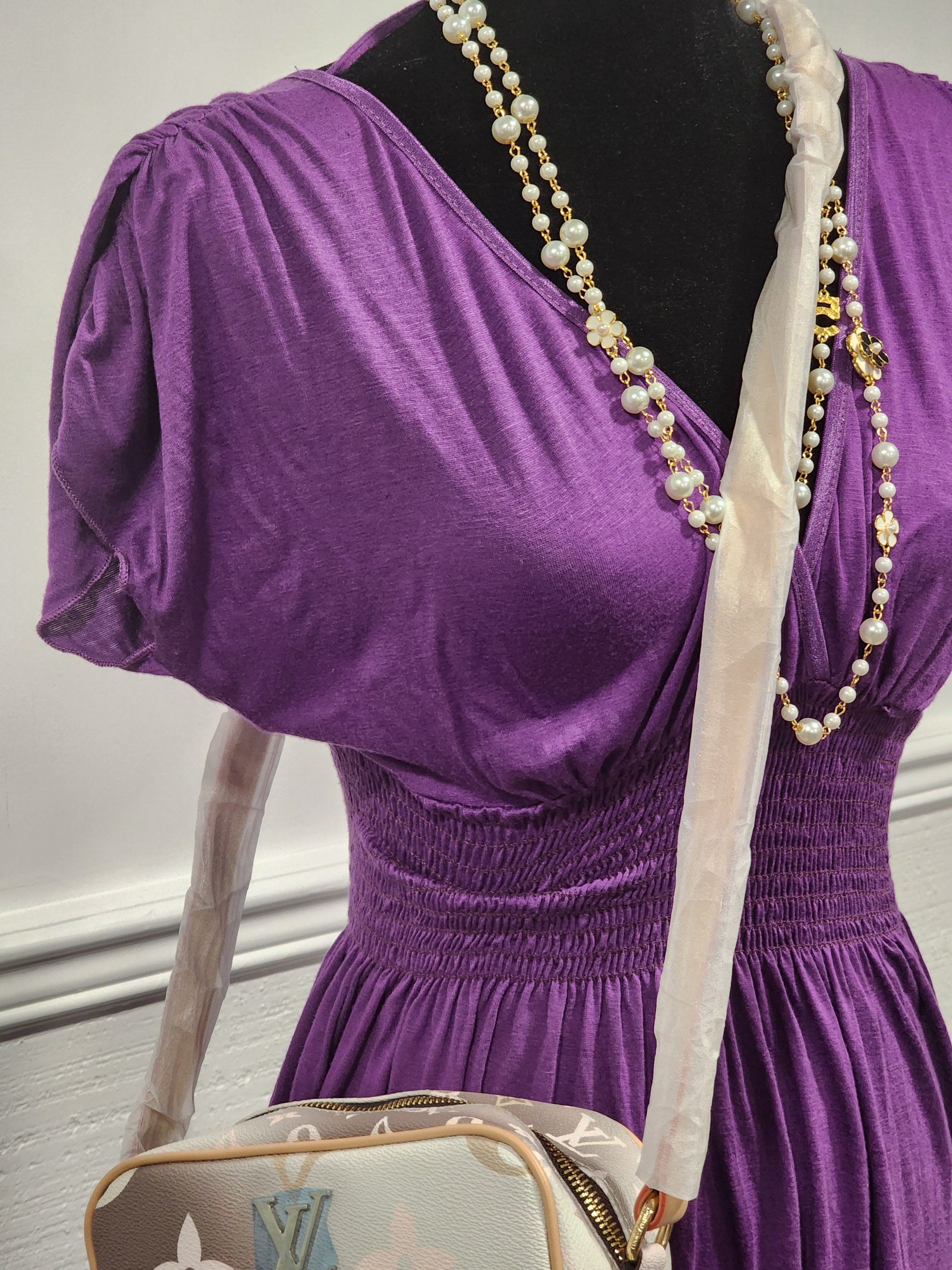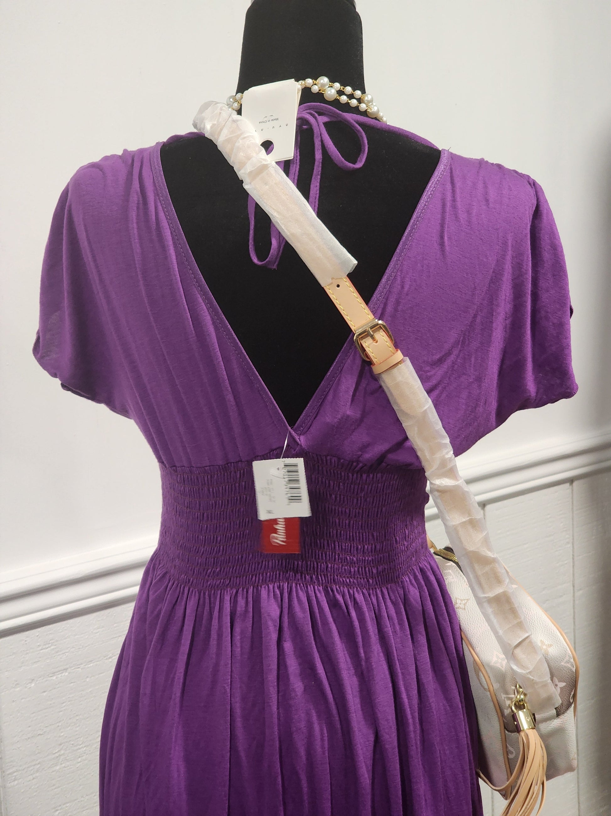 NEW! This Dress is a Purple Soft thin Cotton Blend with a Plunging V Neck Line in the Front and Back of her with a Sexy elastic wast band and a thin tie in the back just below the knee! This is a Great Outfit to throw on Over your Bathing suit at the Beach or to Wear out after a Day on the Beach!
